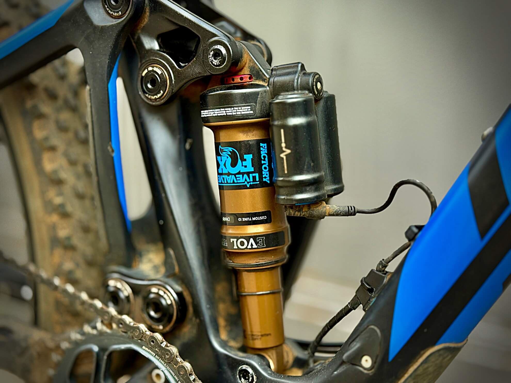 Al posteriore, l’ammortizzatore è un Fox Float Factory DPS LiveValve. Questo ammortizzatore assicura una progressione ottimale e una reattività eccezionale, mantenendo la ruota incollata al terreno per la massima trazione.
